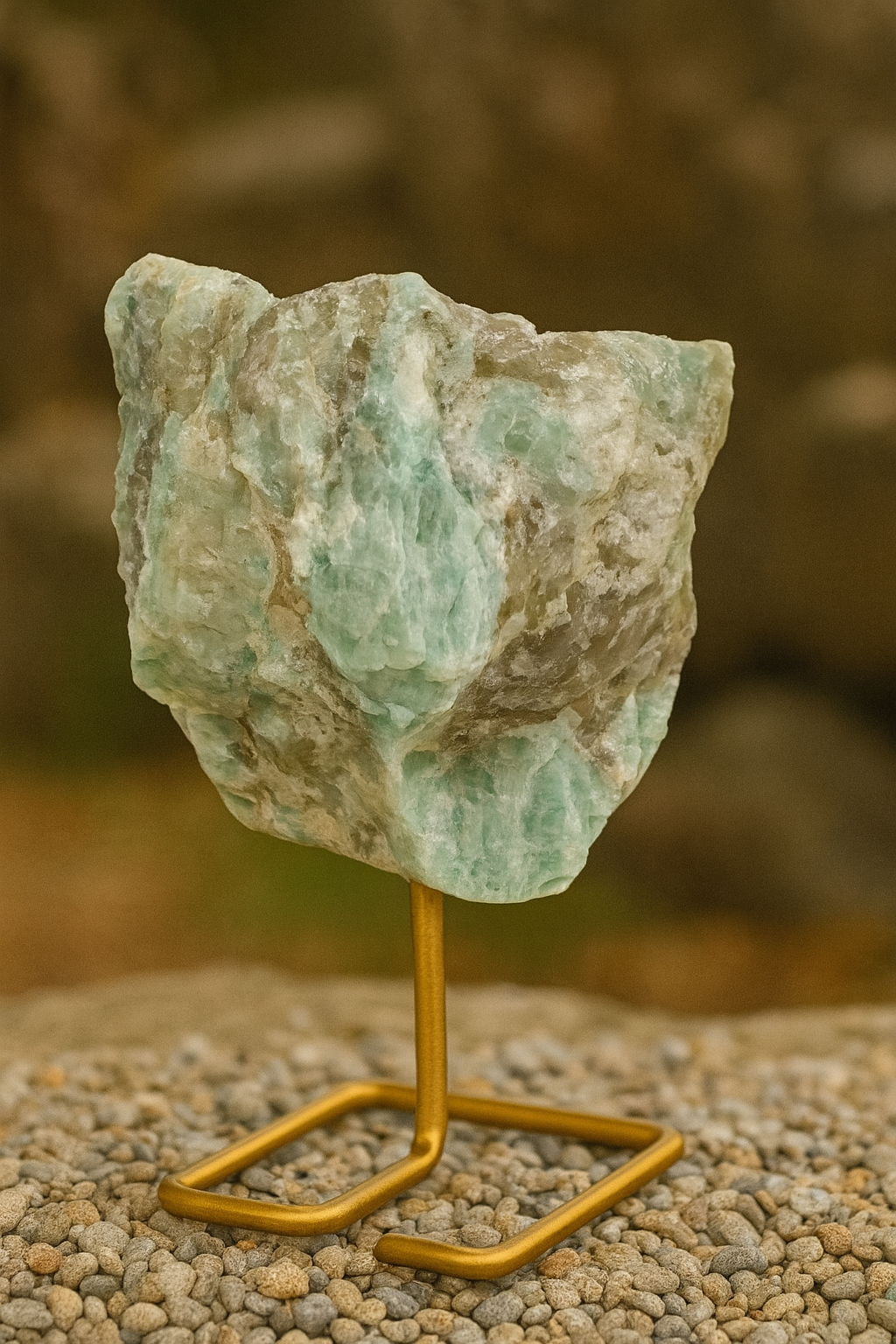 Apresentamos a Amazonita na Base Dourada, uma peça única que combina beleza e significado. A amazonita, conhecida por suas propriedades calmantes e equilibrantes, é uma pedra que transmuta energia negativa em positiva, trazendo tranquilidade e harmonia ao ambiente.