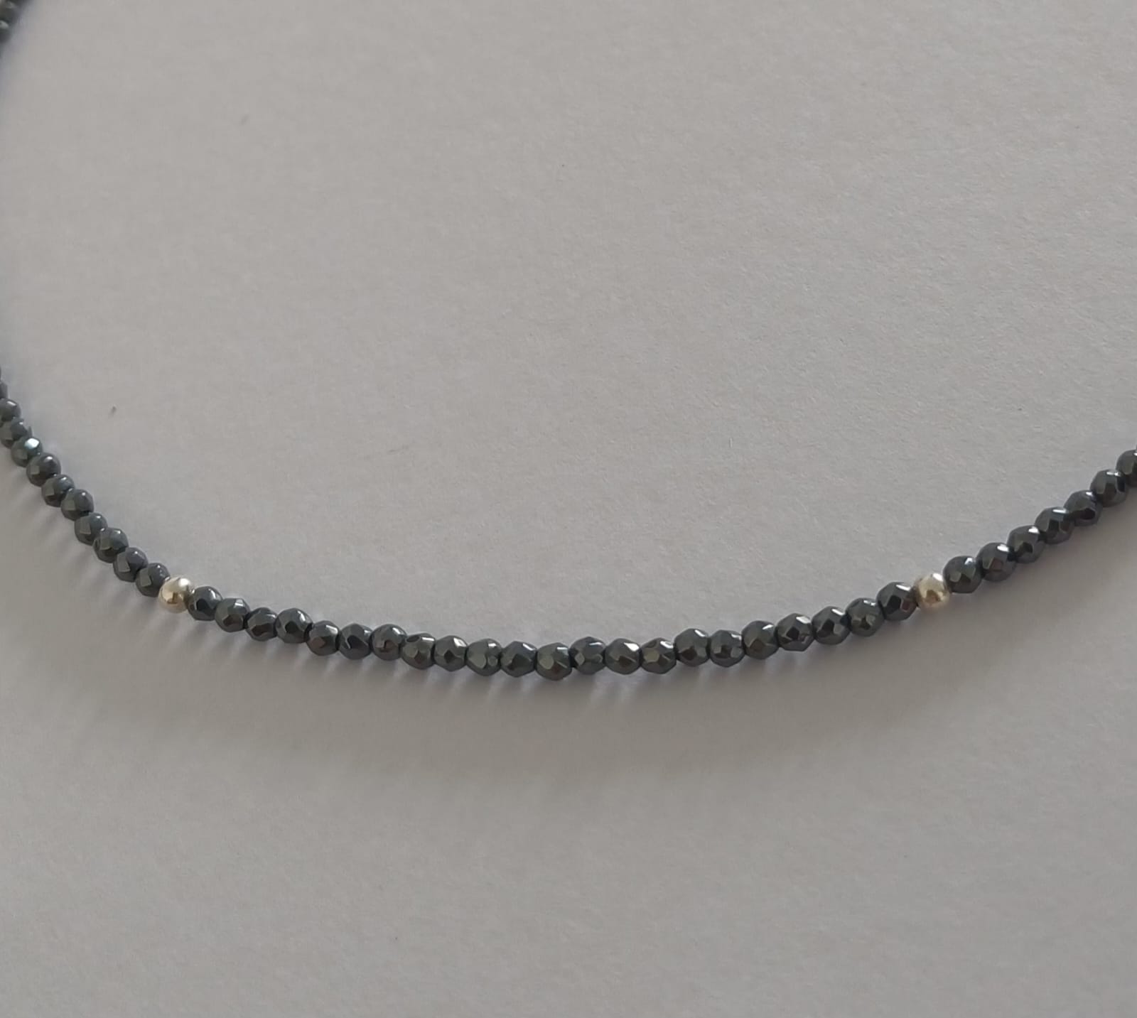 As pedras facetadas de 2mm refletem a luz de maneira encantadora, criando um efeito brilhante que complementa qualquer roupa. Além disso, a hematita é famosa por suas propriedades de equilíbrio e proteção, tornando este colar não apenas um acessório de moda, mas também um talismã de bem-estar.