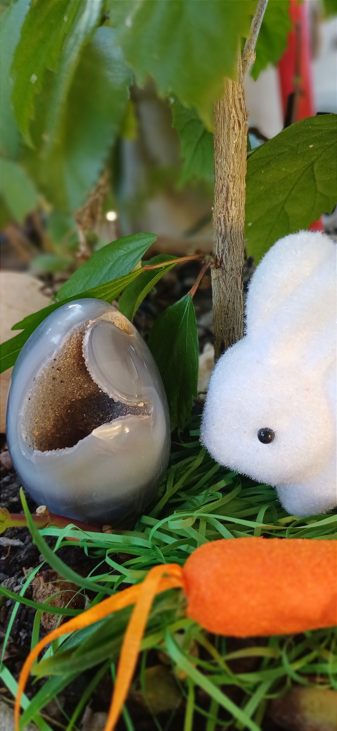 O Ovo de Ágata é uma peça de pedra natural com uma cavidade que destaca sua beleza única e características minerais.
