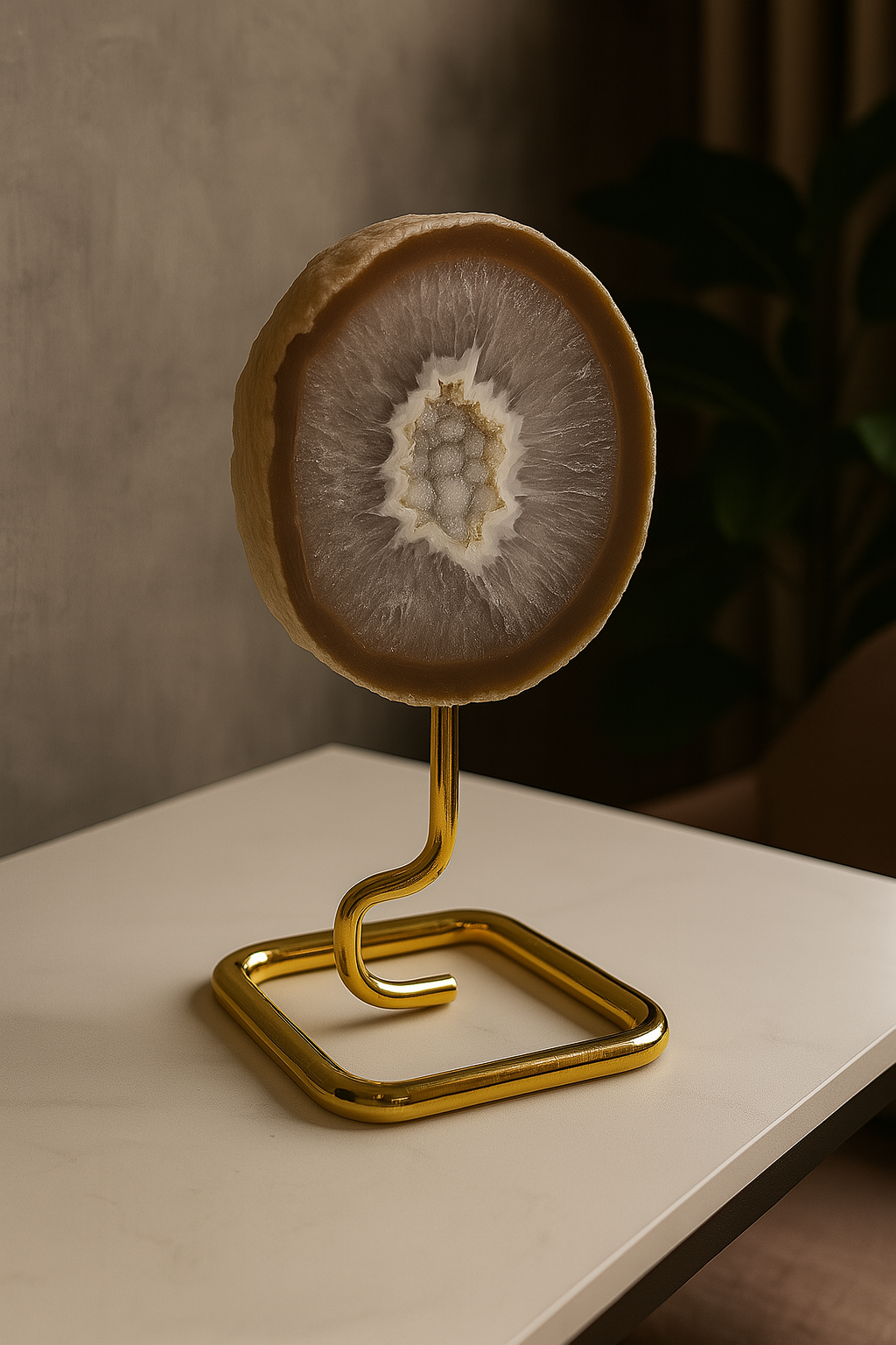 Transforme seu ambiente com a deslumbrante Ágata Natural com Base Dourada. Esta peça única combina a beleza rústica da ágata com a elegância do acabamento dourado, criando um ponto focal impressionante para qualquer espaço. Cada peça é feita com uma fatia de ágata natural, o que significa que cada peça é exclusiva, apresentando padrões e tonalidades que variam de acordo com a natureza da pedra.