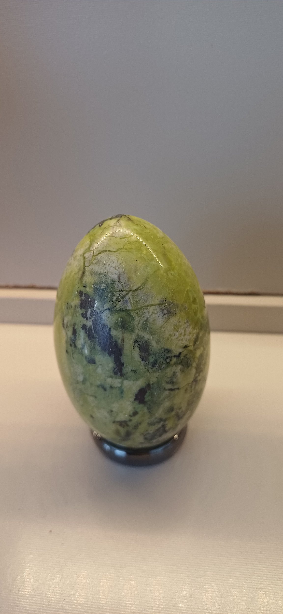 Ovo esculpido em serpentinita, ideal para colecionadores e quem busca a beleza natural das pedras. Apresenta coloração verde com detalhes em tons mais escuros, modelo polido que destaca suas nuances únicas.