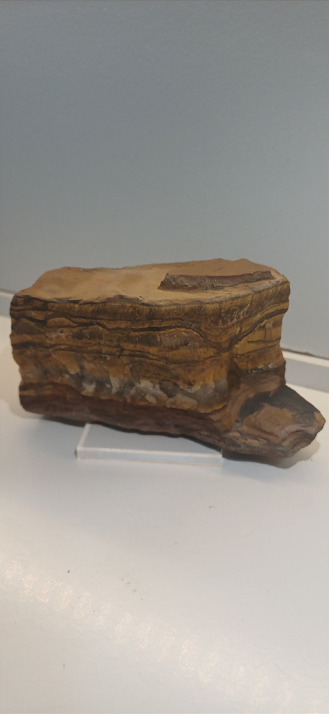 Essa pedra bruta apresenta uma superfície áspera e cores que mesclam tons dourados, amarronzados e ocres, característicos do Olho de Tigre. Sem lapidação, conserva sua forma natural.