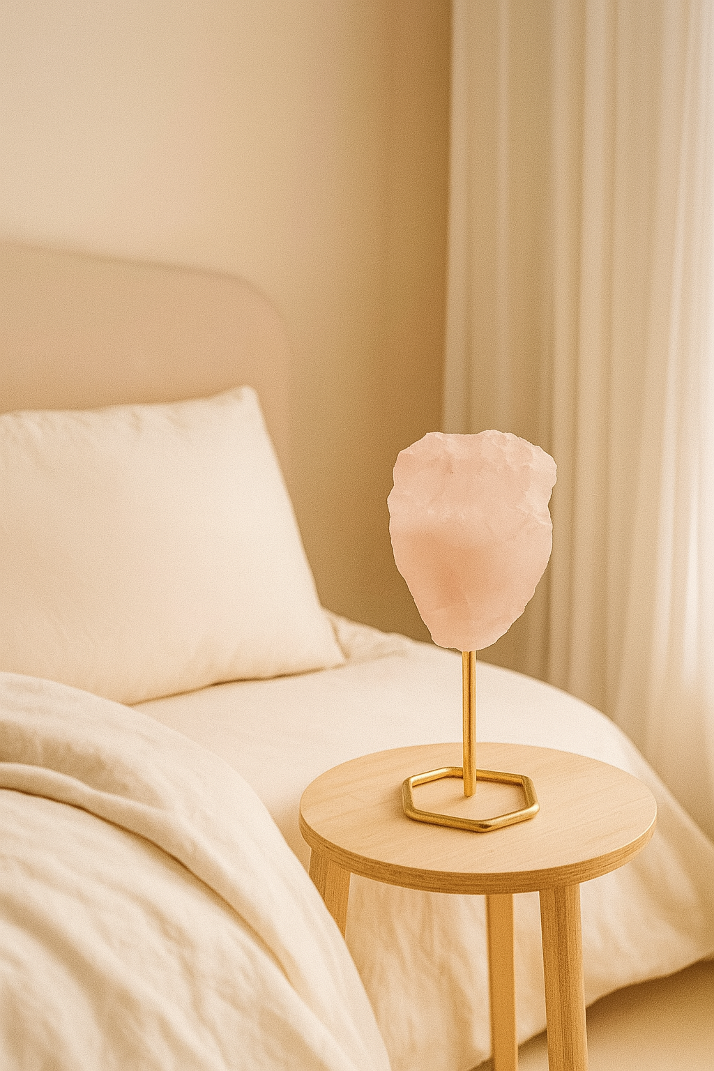 | Material | Quartzo Rosa Natural e Base Metálica Dourada |