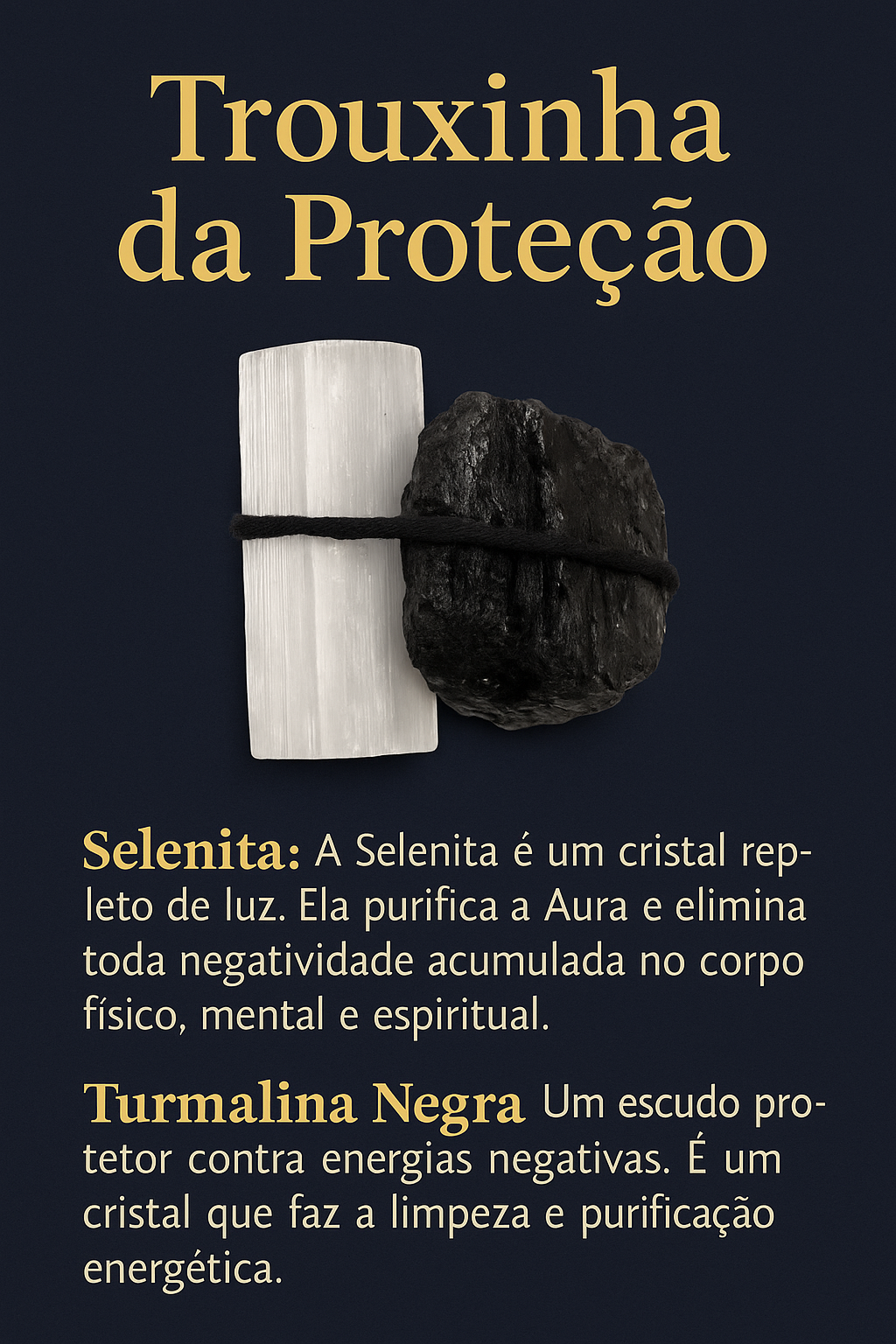 Experimente a Trouxinha da Proteção e descubra como a energia da Turmalina Negra e da Selenita pode transformar a sua realidade, trazendo paz, proteção e autoconhecimento. Uma escolha perfeita para quem valoriza o equilíbrio energético e a proteção espiritual.