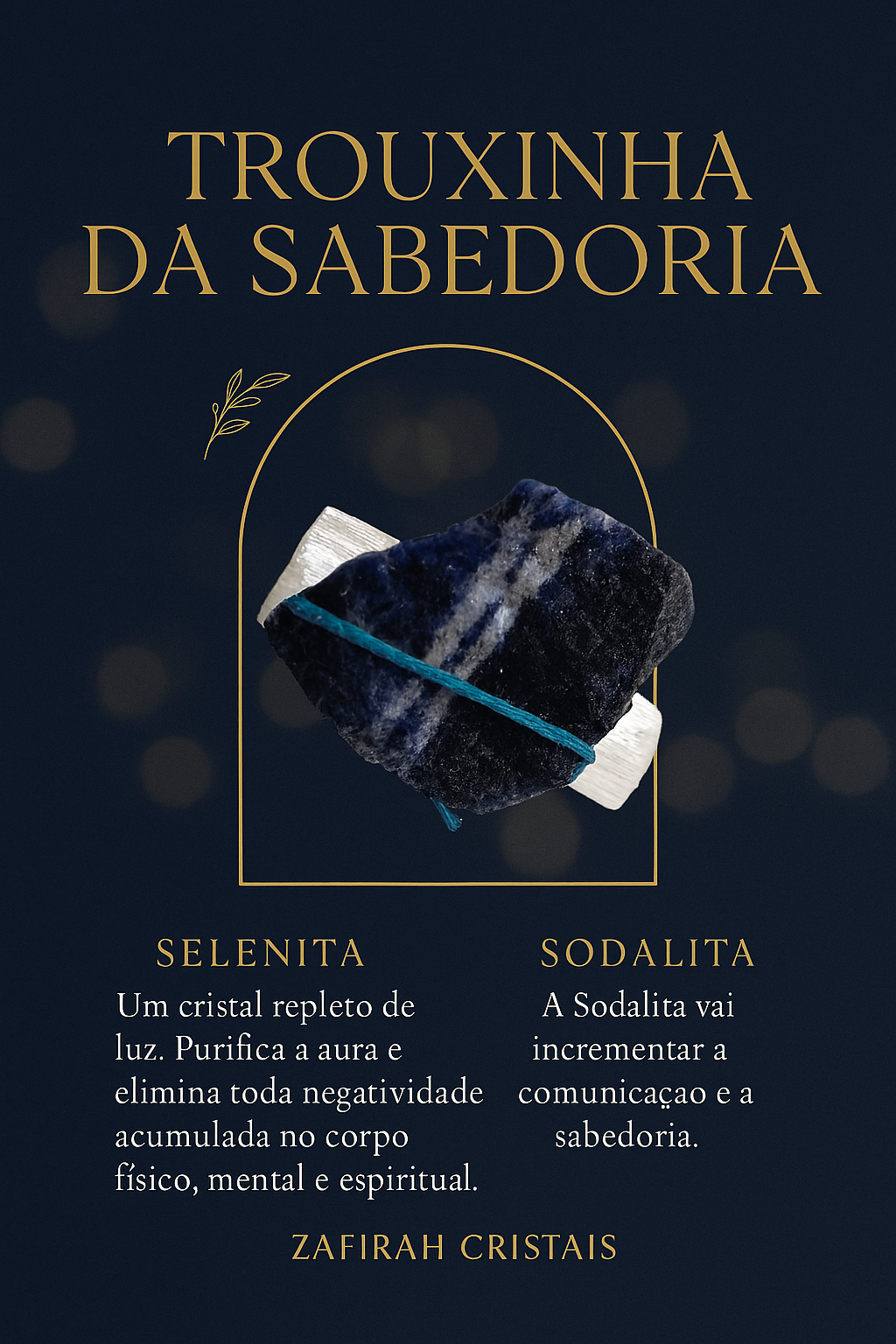 A Trouxinha da Sabedoria é um poderoso conjunto de pedras, unindo as propriedades energéticas da Sodalita e da Selenita. Essa combinação única é ideal para quem busca clareza mental, autoconhecimento e equilíbrio emocional. A Sodalita, com sua cor azul profunda, é famosa por estimular a intuição e a lógica, promovendo a comunicação clara e a criatividade. Já a Selenita, com sua energia suave e protetora, ajuda a purificar ambientes e a conectar-se com esferas espirituais superiores.